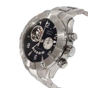Silver-tone stainless steel case and bracelet. Silver-tone stainless steel bezel. Black dial with silver-tone hands and Arabic & index hour markers. Minute markers around the outer rim. Dial Type: Analog. Luminescent hands and markers. Chronograph - two sub-dials displaying: 60 second and 30 minute. Hand wind movement. Scratch resistant sapphire crystal. Screw down crown. Transparent see through case back. Round case shape, case size: 46.5 mm, case thickness: 17 mm. Band width: 23 mm, band length: 7.00 inches. Hidden clasp. Functions: chronograph, hour, minute, second. Additional Info: includes box, certificate of authenticity, original receipt. Defy Classic Series. Sport watch style. Watch label: Swiss Made. Pre-owned Zenith Defy Classic Chronograph Hand Wind Black Dial Men's Watch 03.0526.4021.