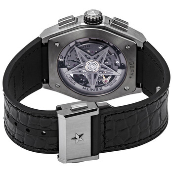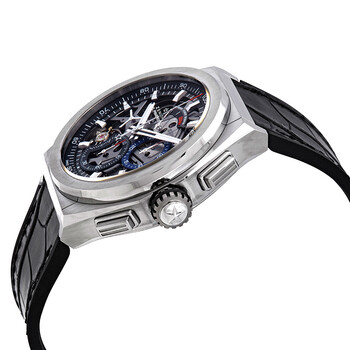 Grey brushed titanium case with a rubber with a black (alligator) leather inlay strap. Fixed grey brushed titanium bezel. Black skeletal dial with luminous rhodium-plated hands and index hour markers. Minute markers. 1/100th second markers around the outer rim. Dial Type: Analog. Luminescent hands and markers. Three sub-dials displaying: 60 second and 30 minute and power reserve indicator. Zenith Calibre El Primero 9004 Automatic movement, containing 53 Jewels, bitting at 36000 vph, and has a power reserve of approximately 50 hours. Scratch resistant sapphire crystal. Pull / push crown. Transparent case back. Round case shape, case size: 44 mm, case thickness: 14.5 mm. Band width: 23 mm. Titanium double fold over clasp. Water resistant at 100 meters / 330 feet. Functions: chronograph, 1/100th of a second, hour, minute, small second, power reserve indicator. Additional Info: bezel 44 vvs baguette-cut diamond. Defy El Primero 21 Series. Luxury watch style. Watch label: Swiss Made. Pre-owned Zenith Defy El Primero 21 Chronograph Automatic Men's Watch 95.9000.9004/78.R582.