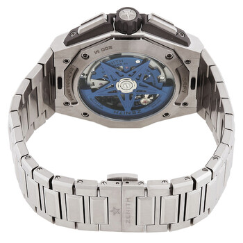 Grey titanium case with a grey titanium bracelet. Fixed grey titanium bezel with a black 12 sided ring. Blue skeleton dial with luminous silver-tone hands and index hour markers. Minute markers. 1/100th seconds markers around the outer rim. Dial Type: Analog. Luminescent hands and markers. Chronograph - three sub-dials displaying: 30 minutes, 60 seconds, and small seconds. Zenith calibre El Primero 9004 automatic movement, containing 53 Jewels, bitting at 36000 vph, and has a power reserve of approximately 50 hours. Scratch resistant sapphire crystal. Transparent case back. Round case shape. Case size: 44 mm. Case thickness: 14.5 mm. Fold over clasp. Water resistant at 100 meters / 330 feet. Functions: chronograph, hour, minute, second, power reserve. Defy Extreme Series. Luxury watch style. Watch label: Swiss Made. Zenith Defy Extreme Chronograph Automatic Men's Watch 95.9100.9004/01.I001.