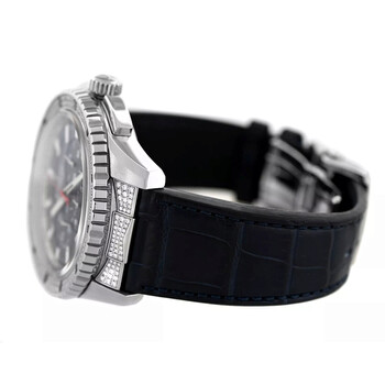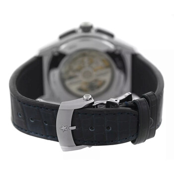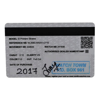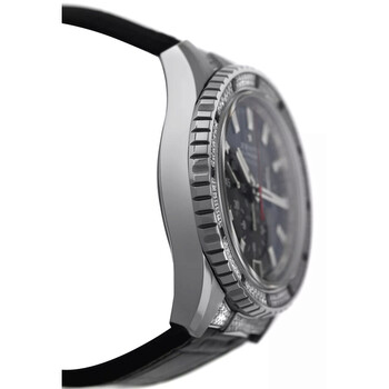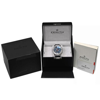 Silver-tone stainless steel case with a black rubber strap. Diamond set stainless steel bezel. Blue dial with silver-tone hands and Arabic numeral & index hour markers. Minute markers around the outer rim. Dial Type: Analog. Luminescent hands and markers. Date display at the 6 o'clock position. Chronograph - three sub-dials displaying: 60 second, 30 minute and 12 hour. Automatic movement. Scratch resistant sapphire crystal. Transparent see through case back. Round case shape, case size: 23 mm. Deployment with push button release clasp. Functions: chronograph, date, hour, minute, second. El Primero Stratos Flyback Series. Casual watch style. Watch label: Swiss Made. Pre-owned Zenith El Primero Stratos Flyback Chronograph Automatic Diamond Blue Dial Men's Watch 16.2063.405.