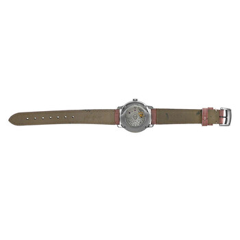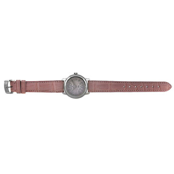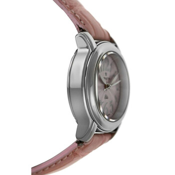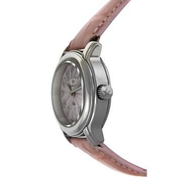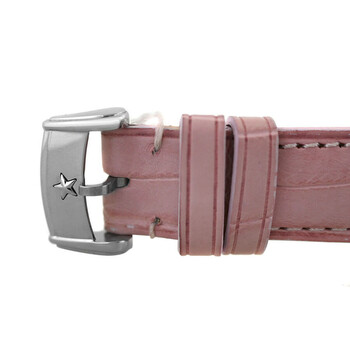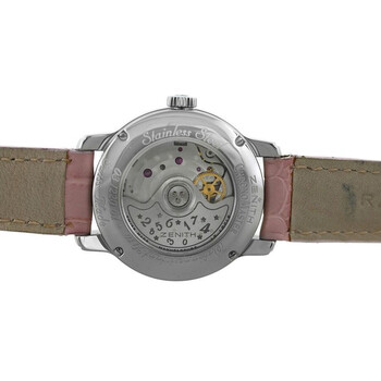 Silver-tone stainless steel case with a pink leather strap. Fixed silver-tone stainless steel bezel. Pink dial with silver-tone hands and Arabic numeral & index hour markers. Minute markers around the outer rim. Dial Type: Analog. Automatic movement. Transparent see through case back. Round case shape, case size: 32 mm. Buckle clasp. Water resistant at 30 meters / 100 feet. Functions: hour, minute, second. Elite Baby Star Series. Casual watch style. Watch label: Swiss Made. Pre-owned Zenith Elite Baby Star Automatic Pink Dial Ladies Watch 03.1220.67.
