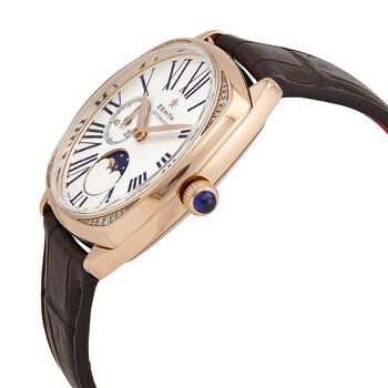 18kt gold case with a brown (alligator) leather (rubber backed) strap. Fixed 18kt gold set with 28 diamonds bezel. Silver dial with gold hands and Roman numeral hour markers. Dial Type: Analog. Two sub-dials displaying: second and moonphase. Zenith Calibre Elite 692 Automatic movement, based upon Zenith Elite 670, containing 27 Jewels, bitting at 28800 vph, and has a power reserve of approximately 50 hours. Scratch resistant sapphire crystal. Pull / push crown. Transparent case back. Square case shape, case size: 37 mm, case thickness: 10.5 mm. Band width: 21 mm. Butterfly with push button release clasp. Water resistant at 30 meters / 100 feet. Functions: hour, minute, small second, moonphases. Heritage Star Moonphase Series. Luxury watch style. Watch label: Swiss Made. Pre-owned Zenith Heritage Star Moonphase Automatic Diamond Silver Dial Ladies Watch 22.1925.692/01.C725.