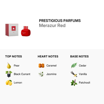 The fragrance settles beautifully with a soothing base of rich cedar, velvety vanilla, and earthy patchouli. These long-lasting notes create a comforting and memorable trail that lingers throughout the day. Whether you're heading to a special event or enjoying a casual day out, Merazur Red adds a graceful finishing touch to your look.
