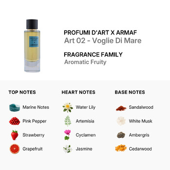 The base notes of sandalwood, white musk, ambergris, cedarwood, ambrette, oakmoss, and leather provide a warm and enduring finish. This rich and earthy foundation ensures that Art 02 - Voglie Di Mare remains a timeless and unforgettable scent, perfect for any occasion.