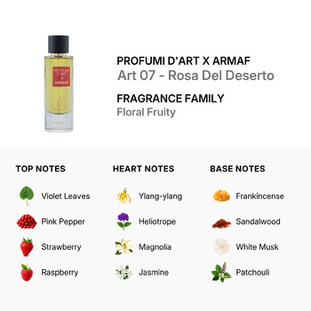 Experience the artistry of scent with Art 07 - Rosa Del Deserto, an exquisite unisex fragrance from Profumi d'Art X Armaf. Launched in 2024, this Eau de Parfum is a mesmerizing blend of vibrant fruits, lush florals, and warm, sensual base notes, creating an unforgettable olfactory journey.