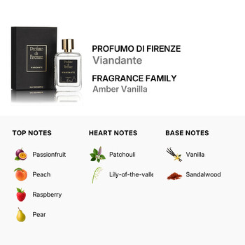 Viandante belongs to the Amber Vanilla fragrance family, a perfect blend of warmth and sweetness. The top notes burst with a fruity medley, featuring the exotic allure of passionfruit, the juiciness of peach, raspberry, and pear, and the tartness of red currant, all rounded off with a zesty hint of lemon. This delightful opening sets the stage for a heart that beats with the earthy depth of patchouli and the delicate floral touch of lily-of-the-valley.