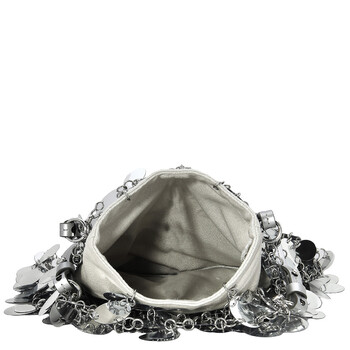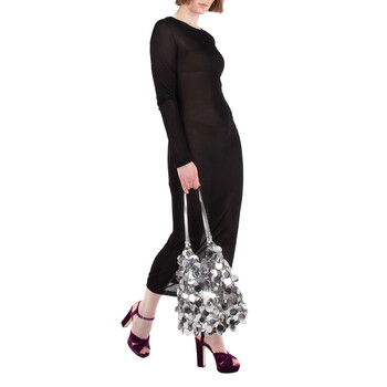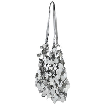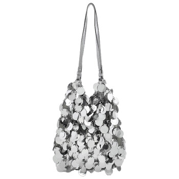 Rabanne Ladies Shoulder Bag. SKU: 24PSS0433PLX128-SILVER. Barcode: 3349661121141. Color: Grey. Size: 27.5 x 22 cm. Rabanne Large Sparkle Discs Shoulder Bag. This shoulder bag features sequin embellishments, leather handle, easy magnetic fastening, secure silver-tone metal hardware, and a spacious interior with canvas lining. 100% polyester, 5% calf, 95% plastic. Made in Madagascar.