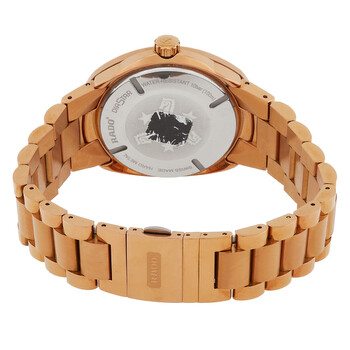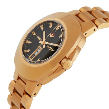 Rose gold-tone stainless steel & rose gold PVD case and bracelet. Fixed rose gold-tone stainless steel & rose gold PVD bezel. Black dial with rose gold-tone hands and index hour markers. Minute markers around the outer rim. Dial Type: Analog. Luminescent hands and markers. Day and date display at the 6 o'clock position. Automatic movement. Scratch resistant sapphire crystal. Screw down crown. Solid case back. Oval case shape, case size: 38.5 mm, case thickness: 12.6 mm. Fold over clasp with a safety release. Water resistant at 100 meters / 330 feet. Functions: date, day, hour, minute, second. Sport watch style. Watch label: Swiss Made. Item Variations: 01.764.0998.3.015. Rado Automatic Black Dial Men's Watch R12998153.