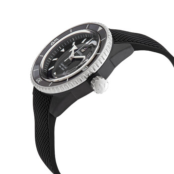 Black high-tech ceramic case with a black rubber strap. Uni-directional rotating black stainless steel bezel. Black dial with silver-tone hands and index hour markers. Minute markers around the outer rim. Dial Type: Analog. Luminescent hands and markers. Date display at the 3 o'clock position. Rado Calibre 03.763.635 automatic movement with an 80-hour power reserve. Scratch resistant sapphire crystal. Round case shape, case size: 43 mm, case thickness: 14.6 mm. Water resistant at 300 meters / 1000 feet. Functions: date, hour, minute, second. Captain Cook Series. Dive watch style. Watch label: Swiss Made. Rado Captain Cook Automatic Black Dial Men's Watch R32129158.