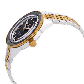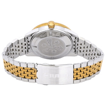 Silver-tone stainless steel case with a two-tone (silver-tone and gold PVD) stainless steel bracelet. Uni-directional rotating black high-tech ceramic bezel. Black dial with gold-tone hands and index hour markers. Minute markers around the outer rim. Dial Type: Analog. Luminescent hands and markers. Date display at the 3 o'clock position. Rado Calibre 03.763.835 automatic movement with an 80-hour power reserve. Scratch resistant sapphire crystal. Screw down crown. Solid case back. Round case shape, case size: 41 mm, case thickness: 12.3 mm. Deployment with push button release clasp. Water resistant at 300 meters / 1000 feet. Functions: date, hour, minute, second. Captain Cook Series. Sport watch style. Watch label: Swiss Made. Item Variations: 01.763.6137.3.015. Rado Captain Cook Automatic Black Dial Men's Watch R32137153.