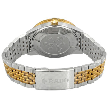 Yellow gold-tone stainless steel case with a two-tone (silver-tone and yellow gold-tone) stainless steel bracelet. Black bezel. Black dial with yellow gold-tone hands and index hour markers. Minute markers around the outer rim. Dial Type: Analog. Luminescent hands and markers. Date display at the 3 o'clock position. Automatic movement. Scratch resistant sapphire crystal. Solid case back. Round case shape, case size: 42 mm. Fold over clasp with a safety release. Water resistant at 300 meters / 1000 feet. Functions: date, hour, minute, second. Additional Info: original box, international warranty card, manual (complete accessories). Captain Cook Series. Luxury watch style. Watch label: Swiss Made. Rado Captain Cook Automatic Black Dial Men's Watch R32138153.