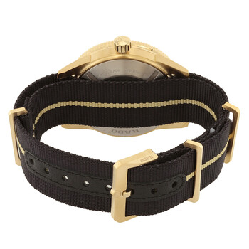 Bronze case with a black fabric strap. Uni-directional rotating brown ceramic bezel. Brown dial with gold-tone hands and index hour markers. Minute markers around the outer rim. Dial Type: Analog. Luminescent hands and markers. Date display at the 3 o'clock position. Automatic movement. Scratch resistant sapphire crystal. Screw down crown. Round case shape, case size: 42 mm, case thickness: 12.5 mm. Pin buckle clasp. Water resistant at 30 meters / 100 feet. Functions: date, hour, minute, second. Captain Cook Series. Sport watch style. Watch label: Swiss Made. Rado Captain Cook Automatic Brown Dial Men's Watch R32504307.
