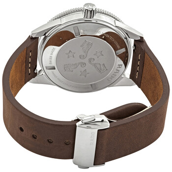 Stainless steel case with a brown leather strap. Uni-directional rotating stainless steel bezel with a black ceramic ring. Brown dial with luminous silver-tone hands and index hour markers. Minute markers around the outer rim. Dial Type: Analog. Luminescent hands and markers. Date display at the 3 o'clock position. Automatic movement with an 80-hour power reserve. Scratch resistant sapphire crystal. Screw down crown. Solid case back. Round case shape. Case size: 42 mm. Case thickness: 12.1 mm. Band width: 20 mm. Fold over clasp with a push button release. Water resistant at 200 meters / 660 feet. Functions: date, hour, minute, second. Casual watch style. Watch label: Swiss Made. Rado Captain Cook Automatic Black Dial Men's Watch R32505305.