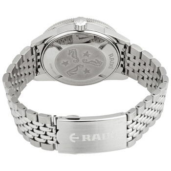 Stainless steel case with a green fabric strap. Uni-directional rotating stainless steel bezel with an inlaid green (high-tech) ceramic ring. Green dial with luminous silver-tone hands and index hour markers. Minute markers around the outer rim. Dial Type: Analog. Luminescent hands and markers. Date display at the 3 o'clock position. Automatic movement with an 80-hour power reserve. Scratch resistant sapphire crystal. Screw down crown. Solid case back. Round case shape. Case size: 42 mm. Case thickness: 12 mm. Band width: 21 mm. Fold over clasp. Water resistant at 200 meters / 660 feet. Functions: date, hour, minute, second. Additional Info: comes with a stainless steel band. Captain Cook Series. Dress watch style. Watch label: Swiss Made. Rado Captain Cook Automatic Green Dial Men's Watch R32505318.