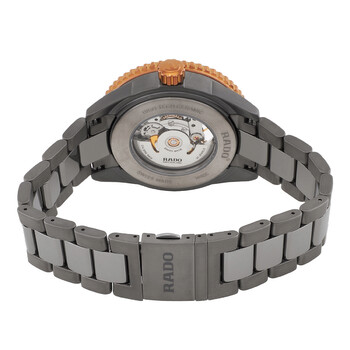 Grey high-tech ceramic case and bracelet. Uni-directional rotating rose gold-tone stainless steel bezel with a grey ceramic insert. Grey dial with rose gold-tone hands and index hour markers. Minute markers around the outer rim. Dial Type: Analog. Luminescent hands and markers. Rado Calibre 808 automatic movement with an 80-hour power reserve. Scratch resistant sapphire crystal. Screw down crown. Transparent case back. Round case shape, case size: 43 mm, case thickness: 14.6 mm. Fold over clasp with a safety release. Water resistant at 300 meters / 1000 feet. Functions: hour, minute, second. Captain Cook Series. Dive watch style. Watch label: Swiss Made. Item Variations: 01.808.6148.3.016. Rado Captain Cook High-Tech Ceramic Skeleton Automatic Grey Dial Men's Watch R32148162.