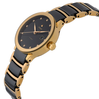Yellow gold-tone stainless steel case with a gold and black high-tech ceramic, stainless steel, titanium bracelet. Fixed gold-tone stainless steel bezel. Black dial with yellow gold-tone hands and diamond hour markers. Dial Type: Analog. Date display at the 3 o'clock position. Automatic movement with a 38 hr power reserve. Scratch resistant sapphire crystal. Round case shape, case size: 28 mm, case thickness: 9.3 mm. Band width: 16 mm, band length: 7.5 inches. Fold over clasp with a safety release. Water resistant at 30 meters / 100 feet. Functions: date, hour, minute, second. Centrix Series. Dress watch style. Watch label: Swiss Made. Item Variations: 01.561.0080.3.076. Rado Centrix Automatic Diamond Black Dial Ladies Watch R30080762.