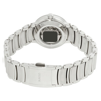 Stainless steel case with a stainless steel bracelet with plasma (high-tech) ceramic inserts. Fixed stainless steel bezel. Silver dial with blue hands and diamond hour markers. Dial Type: Analog. Date display at the 3 o'clock position. Automatic movement. Scratch resistant sapphire crystal. Pull / push crown. Transparent case back. Round case shape. Case size: 28 mm. Case thickness: 6.7 mm. Band width: 15 mm. Fold over clasp with a push button release. Water resistant at 30 meters / 100 feet. Functions: date, hour, minute, second. Additional Info: dial set with 12 diamonds (0.025 carat). Centrix Series. Dress watch style. Watch label: Swiss Made. Rado Centrix Automatic Diamond Silver Dial Ladies Watch R30027733.