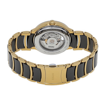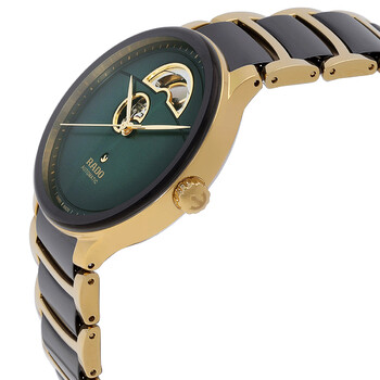 Gold-tone stainless steel case. Gold-tone stainless steel bracelet with black ceramic inserts. Fixed black ceramic bezel. Green dial with gold-tone hands. Minute markers around the outer rim. Dial Type: Analog. Rado Calibre 734 automatic movement with an 80-hour power reserve. Scratch resistant sapphire crystal. Pull / push crown. Transparent case back. Round case shape, case size: 39.5 mm, case thickness: 11.3 mm. Fold over clasp with a safety release. Water resistant at 50 meters / 165 feet. Functions: hour, minute, second. Centrix Series. Casual watch style. Watch label: Swiss Made. Rado Centrix Automatic Green Dial Two-Tone Unisex Watch R30008302.