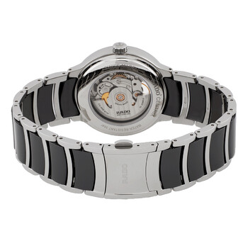Silver-tone stainless steel case. Silver-tone stainless steel bracelet with black ceramic inserts. Fixed black ceramic bezel. Silver to black gradient dial with silver-tone hands. Minute markers around the outer rim. Dial Type: Analog. Rado Calibre 734 automatic movement with an 80-hour power reserve. Scratch resistant sapphire crystal. Pull / push crown. Solid case back. Round case shape, case size: 39.5 mm, case thickness: 11.3 mm. Fold over clasp with a safety release. Water resistant at 50 meters / 165 feet. Functions: hour, minute, second. Centrix Series. Casual watch style. Watch label: Swiss Made. Rado Centrix Automatic Open Heart Two-Tone Unisex Watch R30012152.