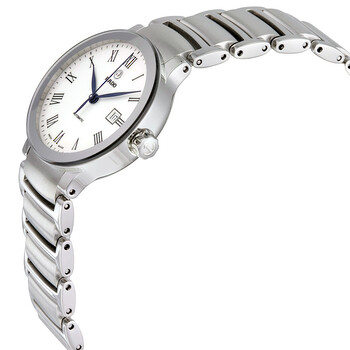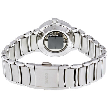 Stainless steel case with a stainless steel bracelet. Fixed stainless steel bezel. White dial with blue hands and Roman numeral hour markers. Minute markers around the outer rim. Dial Type: Analog. Date display at the 3 o'clock position. Automatic movement with a 38-hour power reserve. Scratch resistant sapphire crystal. Pull / push crown. Transparent case back. Case size: 28 mm. Case thickness: 9 mm. Round case shape. Band width: 14 mm. Band length: 7 inches. Deployment clasp. Water resistant at 30 meters / 100 feet. Functions: date, hour, minute, second. Dress watch style. Watch label: Swiss Made. Rado Centrix Automatic White Dial Stainless Steel Ladies Watch R30940013.