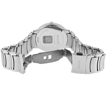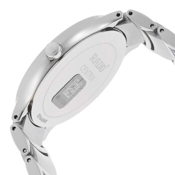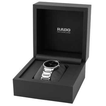 Stainless steel case with a stainless steel bracelet. Fixed stainless steel bezel set with white diamonds. Black dial with silver-tone hands and diamond hour markers. Diamonds set at the 3, 6, 9 and 12 o'clock positions. Dial Type: Analog. Date display at the 3 o'clock position. Rado calibre 115 quartz movement. Scratch resistant sapphire crystal. Pull / push crown. Solid case back. Round case shape. Case size: 38 mm. Case thickness: 7.3 mm. Band width: 22 mm. Fold over clasp with a push button release. Water resistant at 30 meters / 100 feet. Functions: date, hour, minute, second. Centrix Series. Dress watch style. Watch label: Swiss Made. Rado Centrix Black Dial Stainless Steel Men's Watch R30630713.