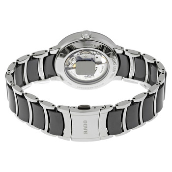 Stainless steel case with a stainless steel bracelet with black ceramic inserts. Fixed black ceramic bezel. Black (open heart) dial with silver-tone hands and index hour markers. Minute markers around the outer rim. Dial Type: Analog. Rado calibre 734 automatic movement with an 80-hour power reserve. Scratch resistant sapphire crystal. Pull / push crown. Transparent case back. Case size: 38 mm. Case thickness: 10.1 mm. Round case shape. Band width: 20 mm. Deployment clasp. Water resistant at 30 meters / 100 feet. Functions: hour, minute, second. Additional Info: ref# 734.0178.3.015. Luxury watch style. Watch label: Swiss Made. Rado Centrix Black Skeleton Dial Men's Watch R30178152.