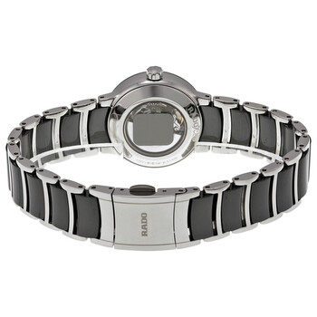 Stainless steel case with a stainless steel bracelet with black ceramic inserts. Fixed black ceramic bezel. Black dial with steel hands. Diamond-set index markers at the 3, 6, 9 and 12 o'clock positions. The Rado name appears below the 12 o'clock position. Dial Type: Analog. Date display at the 3 o'clock position. Rado calibre 561 (ETA 2671) automatic movement, based upon ETA 2671, containing 25 Jewels, bitting at 28800 vph, and has a power reserve of approximately 38 hours. Scratch resistant sapphire crystal. Steel crown. Transparent case back. Round case shape. Case size: 28 mm. Case thickness: 9 mm. Band width: 14 mm. Band length: 7 inches. Fold over clasp with a push button release. Water resistant at 30 meters / 100 feet. Functions: hours, minutes, seconds, hours. Centrix Series. Fashion watch style. Watch label: Swiss Made. Item Variations: 561.0942.3.070. Rado Centrix Ceramic Black Dial Ladies Watch R30942702.