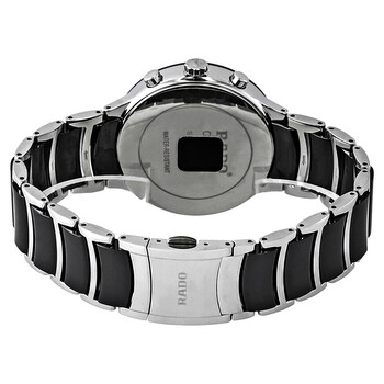 Stainless steel case with a stainless steel bracelet with black ceramic inserts. Fixed black ceramic bezel. Black dial with luminous silver-tone hands and index hour markers. Minute markers around the outer rim. Dial Type: Analog. Date display at the 4 o'clock position. Chronograph - three sub-dials displaying: 60 second, 30 minute and 1/10th of a second. Quartz movement. Scratch resistant sapphire crystal. Pull / push crown. Solid case back. Case size: 40 mm. Round case shape. Bracelet width: 20 mm. Deployment clasp with a push button release. Water resistant at 50 meters / 165 feet. Functions: chronograph, date, hour, minute, second. Dress watch style. Watch label: Swiss Made. Rado Centrix Chronograph Black Ceramic and Steel Men's Watch R30130152.