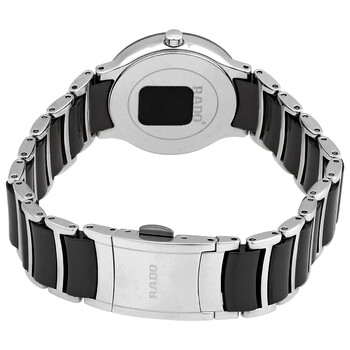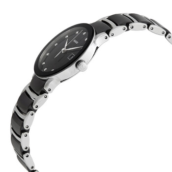 Stainless steel case with a stainless steel bracelet with black (high-tech) ceramic links. Fixed black ceramic bezel. Black dial with silver-tone hands and diamond hour markers. Dial Type: Analog. Date display at the 3 o'clock position. Quartz movement. Scratch resistant sapphire crystal. Pull / push crown. Solid case back. Round case shape. Case size: 28 mm. Case thickness: 9 mm. Band width: 16 mm. Deployment clasp with a push button release. Water resistant at 30 meters / 100 feet. Functions: date, hour, minute, second. Additional Info: original box, manual (complete accessories). Centrix Diamonds Series. Luxury watch style. Watch label: Swiss Made. Rado Centrix Diamonds Quartz Black Dial Ladies Watch R30935752.