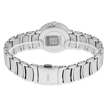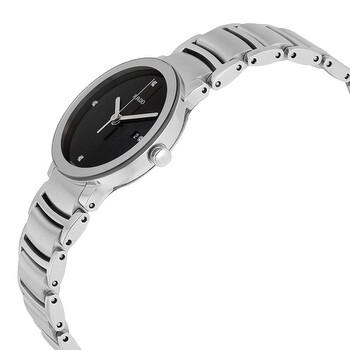 Stainless steel case with a stainless steel bracelet. Fixed stainless steel bezel. Black dial with silver-tone hands. Diamonds mark the 3, 6, 9 and 12 o'clock position. Dial Type: Analog. Date display appears at the 3 o'clock position. Quartz movement. Scratch resistant sapphire crystal. Pull / push crown. Solid case back. Case size: 28 mm. Case thickness: 8 mm. Round case shape. Band width: 18 mm. Double push button fold over clasp. Water resistant at 30 meters/ 100 feet. Functions: hours, minutes, seconds, date. Fashion watch style. Rado Centrix Jubile Black Dial Ladies Watch R30928713.