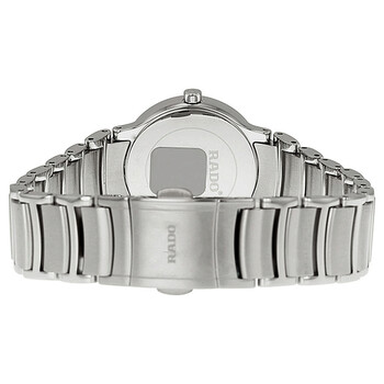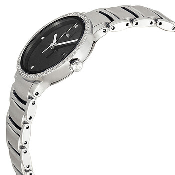 Stainless steel case with a stainless steel bracelet. Fixed stainless steel bezel set with 64 diamonds. Black dial with silver-tone hands. Diamonds mark the 3, 6, 9 and 12 o'clock positions. Dial Type: Analog. Date display at the 3 o'clock position. Quartz movement. Scratch resistant sapphire crystal. Pull / push crown. Solid case back. Case diameter: 28 mm. Case thickness: 7 mm. Round case shape. Band width: 17 mm. Deployment with push button clasp. Water resistant at 30 meters / 100 feet. Functions: date, hour, minute, second. Dress watch style. Watch label: Swiss Made. Rado Centrix Jubile Diamond Stainless Steel Ladies Watch R30933713.
