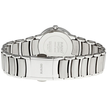 Stainless steel case with a stainless steel bracelet. Fixed stainless steel bezel set with diamonds. Mother of pearl dial with diamond markers at the quarter hour positions. The Rado name appears below the 12 o'clock position. Date display appears at the 3 o'clock position. Quartz movement. Scratch resistant sapphire crystal. Solid case back. Case diameter: 28 mm. Deployment clasp. Water resistant at 30 meters / 100 feet. Rado Centrix Mother of Pearl Ladies Watch R30936903.
