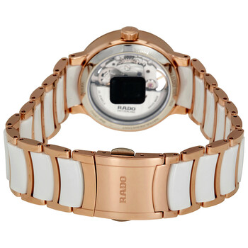 Rose gold PVD stainless steel case with a rose gold PVD stainless steel bracelet with white (high tech) ceramic inserts. Fixed rose gold PVD bezel. Mother of pearl (open heart) dial with rose gold-tone hands and diamond hour markers. Dial Type: Analog. Rado calibre 734 automatic movement with an 80-hour power reserve. Scratch resistant sapphire crystal. Pull / push crown. Transparent case back. Round case shape. Case size: 33 mm. Case thickness: 10 mm. Band width: 18 mm. Fold over clasp. Water resistant at 30 meters / 100 feet. Functions: hour, minute, second. Centrix Series. Luxury watch style. Watch label: Swiss Made. Rado Centrix Open Heart Mother Of Pearl Dial Automatic Ladies Watch R30248902.