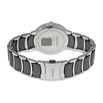 Black ceramic case with a stainless steel bracelet with black ceramic inserts. Fixed black ceramic bezel. Black dial with silver-tone hands. Diamond markers at the 3, 6, 9 and 12 o'clock positions. The rado name appears below the 12 o'clock position. Dial Type: Analog. Date display at the 3 o'clock position. ETA caliber 955.112 quartz movement. Scratch resistant sapphire crystal. Pull / push crown. Solid case back. Round case shape. Case size: 38 mm. Case thickness: 7.7 mm. Band width: 22 mm. Hidden double locking clasp. Water resistant at 30 meters / 100 feet. Functions: hours, minutes, seconds, date. Centrix Series. Casual watch style. Watch label: Swiss Made. Rado Centrix Quartz Black Dial Black Ceramic Unisex Watch R30934712.