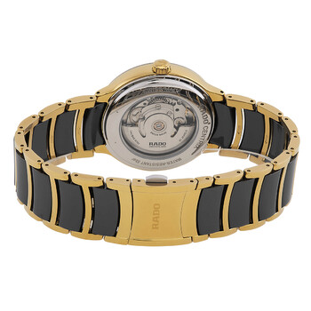 Two-tone (black and gold-tone) stainless steel/ PVD case with a two-tone (black and gold-tone) high-tech ceramic, stainless steel / PVD bracelet. Fixed black bezel. Black dial with gold-tone hands and diamond hour markers. Dial Type: Analog. Date display at the 6 o'clock position. Rado Calibre R763 automatic movement with an 80-hour power reserve. Scratch resistant sapphire crystal. Transparent see through case back. Round case shape, case size: 39.5 mm, case thickness: 11.3 mm. Deployment clasp. Water resistant at 50 meters / 165 feet. Functions: date, hour, minute, second. Centrix Series. Dress watch style. Watch label: Swiss Made. Item Variations: 01.763.6008.3.074. Rado Centrix Quartz Diamond Black Dial Unisex Watch R30008742.
