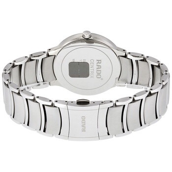 Stainless steel case with a stainless steel bracelet. Fixed stainless steel bezel. Silver dial with rose gold-tone hands and rose gold-tone index hour markers. Minute markers around the outer rim. Dial Type: Analog. Date display at the 3 o'clock position. Quartz movement. Scratch resistant sapphire crystal. Pull / push crown. Solid case back. Case diameter: 38 mm. Round case shape. Band width: 20 mm. Band length: 8 inches. Deployment clasp. Water resistant at 30 meters / 100 feet. Functions: date, hour, minute, second. Dress watch style. Watch label: Swiss Made. Rado Centrix Quartz Silver Dial Stainless Steel Men's Watch R30927123.