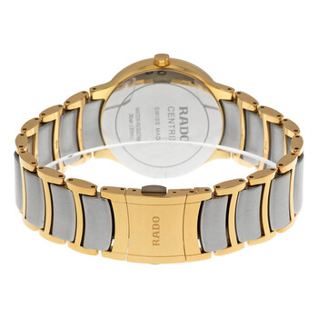 Stainless steel case with a two-tone (silver and rose gold-tone) stainless steel bracelet. Fixed rose gold-tone bezel. White dial with rose gold-tone hands and stick hour markers. Minute markers around the outer rim. Dial Type: Analog. Luminescent hands and markers. Date display appears at the 3 o'clock position. Quartz movement. Scratch resistant sapphire crystal. Push / pull crown. Case diameter: 38 mm. Round case shape. Deployment clasp. Water resistant at 30 meters / 100 feet. Functions: date, hour, minute, second. Dress watch style. Watch label: Swiss Made. Rado Centrix Automatic Two-Tone Stainless Steel Men's Watch R30554103.