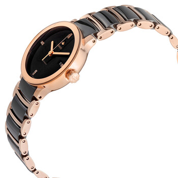 Rose gold PVD stainless steel case with a rose gold PVD stainless steel bracelet with black ceramic inserts. Fixed rose gold PVD bezel. Black dial with rose gold-tone hands. Twin diamonds mark the 3, 6, 9 and 12 o'clock positions. Dial Type: Analog. Date display at the 3 o'clock position. ETA caliber 2671 automatic movement, containing 25 Jewels, bitting at 28800 vph, and has a power reserve of approximately 38 hours. Scratch resistant sapphire crystal. Pull / push crown. Transparent case back. Round case shape. Case size: 28 mm. Case thickness: 9.3 mm. Fold over clasp. Water resistant at 30 meters / 100 feet. Functions: date, hour, minute, second. Centrix S Series. Luxury watch style. Watch label: Swiss Made. Rado Centrix S Automatic Black Dial Ladies Watch R30183712.