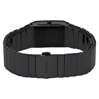 Black (high-tech) ceramic case with a black high-tech ceramic bracelet. Fixed black (high-tech) ceramic bezel. Black dial with rose gold-tone hands and index hour markers. Diamonds set at the 3, 6, 9 and 12 o'clock positions. Dial Type: Analog. Rado calibre 420 quartz movement. Scratch resistant sapphire crystal. Pull / push crown. Solid case back. Square case shape. Case dimensions: 22.9 mm x 31.7 mm. Cse thickness: 6.6 mm. Deployment clasp. Water resistant at 50 meters / 165 feet. Functions: hour, minute. Additional Info: dial set with 4 diamonds (0.011 carats). Ceramica Series. Dress watch style. Watch label: Swiss Made. Rado Ceramica Black Diamond Dial Ladies Ceramic Watch R21702722.