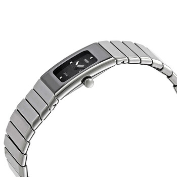 Silver-tone ceramic with plasma treatment case with a silver-tone ceramic with plasma treatment bracelet. Fixed silver-tone ceramic with plasma treatment bezel. Black dial with silver-tone hands and diamond hour markers. Dial Type: Analog. Quartz movement. Scratch resistant sapphire crystal. Pull / push crown. Solid case back. Rectangle case shape, case size: 19 mm x 33 mm, case thickness: 6 mm. Band width: 19 mm. Titanium double folding clasp. Water resistant at 30 meters / 100 feet. Functions: hour, minute. Additional Info: 4 white diamons on dial. .011 ctw. Luxury watch style. Watch label: Swiss Made. Rado Ceramica Quartz Diamond Black Dial Ladies Watch R21827752.