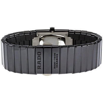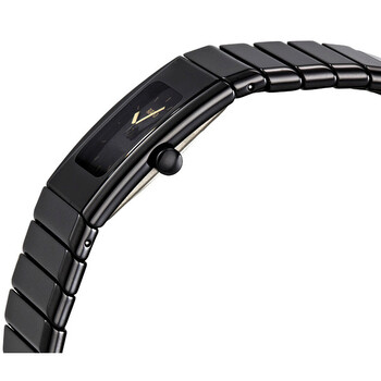 Black ceramic case with a black ceramic link bracelet. Fixed black ceramic bezel. Black dial with gold-tone hands and index hour markers. The Rado name appears below the 12 o'clock position. Dial Type: analog. Quartz movement. Scratch resistant sapphire crystal. Solid casae back. Case dimensions: 24 mm x 19 mm. Case thickness: 6 mm. Band width: 19 mm. Push button deployment clasp. Water resistant at 30 meters/ 100 feet. Functions: hours, minutes, seconds. Dress watch style.