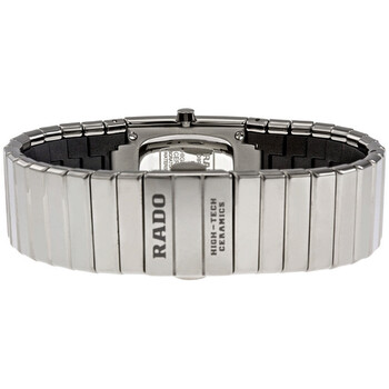Platinum tone ceramic case with a platinum tone ceramic bracelet. Fixed platinum-tone ceramic bezel. Black dial with luminous hands. No markers. the rado name appears below the 12 o'clock position. Dial Type: Analog. Rado Calibre 963 quartz movement. Scratch resistant sapphire crystal. Solid case back. Rectangle case shape, case size: 25 mm x 20 mm, case thickness: 7 mm. Band width: 25 mm. Deployment with push button release clasp. Water resistant at 30 meters / 100 feet. Functions: hours, minutes. Dress watch style. Watch label: Swiss Made. Rado Ceramica Small Black Dial Platinum Tone Ceramic Ladies Watch R21827232.