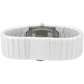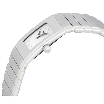 White ceramic case with a white ceramic bracelet. Fixed white ceamic bezel. White dial with luminous hands and index hour markers. Dial Type: Analog. Quartz movement. Scratch resistant sapphire crystal. Pull / push crown. Solid case back. Rectangle case shape. Case dimensions: 24 mm x 19 mm. Case thickness: 6 mm. Band width: 19 mm. Fold over clasp with a push button release. Water resistant at 30 meters / 100 feet. Functions: hours, minutes. Rado Ceramica Series. Dress watch style. Rado Ceramica Small White Dial White Ceramic Ladies Watch R21712022.