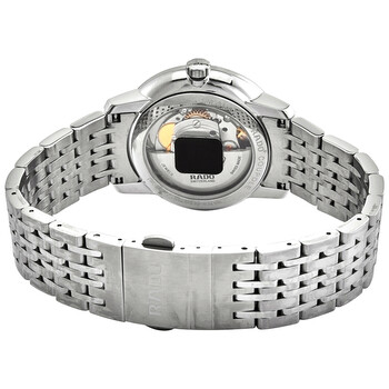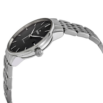 Stainless steel case with a stainless steel bracelet. Fixed stainless steel bezel. Black dial with silver-tone leaf-style hands and index hour markers. Dial Type: Analog. Date display at the 3 o'clock position. Automatic movement with an 80-hour power reserve. Scratch resistant sapphire crystal. Pull / push crown. Transparent case back. Round case shape. Case size: 37.7 mm. Case thickness: 10.2 mm. Fold over clasp. Water resistant at 50 meters / 165 feet. Functions: date, hour, minute, second. Coupole Classic Series. Dress watch style. Watch label: Swiss Made. Rado Coupole Classic Automatic Black Dial Men's Watch R22860154.