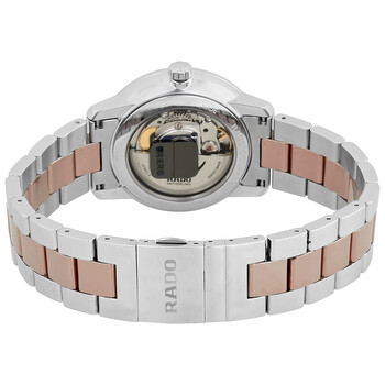 Stainless steel case with a stainless steel bracelet with rose gold ceramos center links. Fixed stainless steel bezel. Black dial with rose gold-tone hands and index hour markers. Dial Type: Analog. Date display at the 3 o'clock position. Rado calibre 763 (ETA C07.611) automatic movement with an 80-hour power reserve. Scratch resistant sapphire crystal. Pull / push crown. Transparent case back. Round case shape. Case size: 38 mm. Case thickness: 10.2 mm. Band width: 20 mm. Fold over clasp. Water resistant at 50 meters / 165 feet. Functions: date, hour, minute, second. Dress watch style. Watch label: Swiss Made. Rado Coupole Classic Automatic Black Dial Men's Watch R22860162.