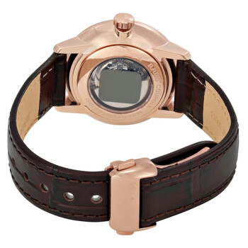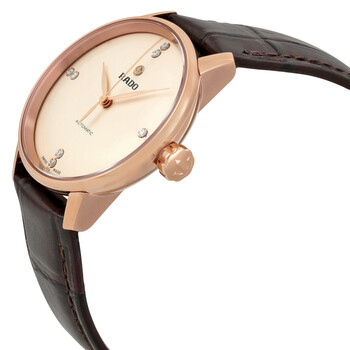 Rose gold PVD stainless steel case with a dark brown leather strap. Fixed rose gold PVD bezel. Champagne dial with rose gold-tone hands. Diamonds mark the 3, 6, 9 and 12 o'clock positions. Dial Type: Analog. Automatic movement. Scratch resistant sapphire crystal. Pull / push crown. Transparent case back. Case size: 31.8 mm. Case thickness: 9.7 mm. Round case shape. Deployment clasp. Water resistant at 50 meters / 165 feet. Functions: hour, minute, second. Additional Info: 8 diamonds, 0.052 carat. Dress watch style. Watch label: Swiss Made. Item Variations: 01.561.3865.2.176. Rado Coupole Classic Automatic Ladies Watch R22865765.
