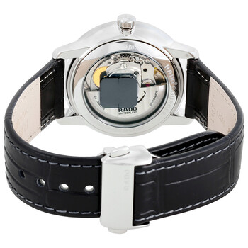 Stainless steel case with a black leather strap. Fixed stainless steel bezel. Silver dial with silver-tone leaf-style shape hands and index hour markers. Dial Type: Analog. Date display at the 3 o'clock position. Rado calibre 763 (ETA C07.611) automatic movement, based upon ETA C07.611, containing 25 Jewels, bitting at 21600 vph, and has a power reserve of approximately 80 hours. Scratch resistant sapphire crystal. Transparent case back. Round case shape. Case size: 38 mm. Case thickness: 10 mm. Band width: 20 mm. Band length: 7.5 inches. Deployment clasp. Water resistant at 50 meters / 165 feet. Functions: date, hour, minute, second. Additional Info: ref# 763.3860.4.101. Coupole Classic Series. Dress watch style. Watch label: Swiss Made. Rado Coupole Classic Automatic Silver Dial Men's Watch R22860015.