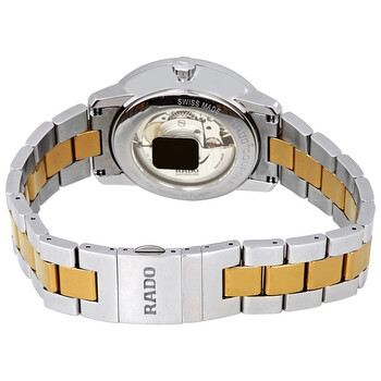 Stainless steel case with a stainless steel bracelet with yellow gold ceramic links. Fixed stainless steel bezel. Silver dial with yellow gold-tone hands and index hour markers. Minute markers around the outer rim. Dial Type: Analog. Date display above the 6 o'clock position. Power reserve indicator. Rado calibre 772 automatic movement with an 80-hour power reserve. Scratch resistant sapphire crystal. Transparent case back. Round case shape, case size: 41 mm, case thickness: 11.7 mm. Band width: 22 mm. Water resistant at 50 meters / 165 feet. Functions: date, hour, minute, second, power reserve indicator. Casual watch style. Watch label: Swiss Made. Rado Coupole Classic Automatic Silver Dial Men's Watch R22878032.