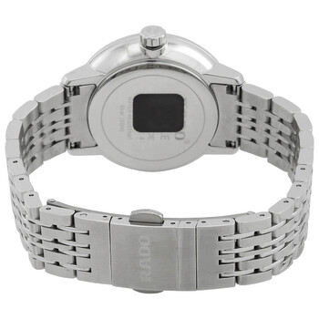 Silver-tone stainless steel case and bracelet. Fixed silver-tone stainless steel bezel. Blue mother of pearl dial with silver-tone hands and index hour markers. Dial Type: Analog. Date display at the 3 o'clock position. One subdial displaying: moonphase. Rado Calibre 03.084.022 quartz movement. Scratch resistant sapphire crystal. Pull / push crown. Solid case back. Round case shape, case size: 34 mm, case thickness: 9.7 mm. Deployment with push button release clasp. Water resistant at 50 meters / 165 feet. Functions: date, hour, minute, second, moonphase. Coupole Classic Moonphase Series. Dress watch style. Watch label: Swiss Made. Item Variations: 01.084.3883.4.291. Rado Coupole Classic Moonphase Quartz Blue Mother of Pearl Dial Ladies Watch R22883913.