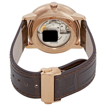 Rose gold-tone stainless steel case with a brown (croc-embossed) leather strap. Fixed rose gold-tone bezel. Blue dial with rose gold-tone hands and index hour markers. Minute markers around the outer rim. Dial Type: Analog. Date display above the 6 o'clock position. Power reserve indicator. Automatic movement with an 80-hour power reserve. Scratch resistant sapphire crystal. Transparent case back. Round case shape. Case size: 41 mm. Case thickness: 11.7 mm. Band width: 21 mm. Deployment clasp with a push button release. Water resistant at 50 meters / 165 feet. Functions: date, hour, minute, second, power reserve. Dress watch style. Watch label: Swiss Made. Rado Coupole Classic XL Automatic Blue Dial Men's Watch R22879205.